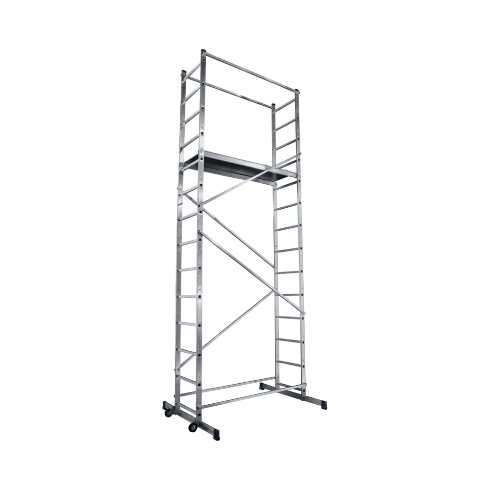 Надежные опоры и траверсы легко устанавливаются и повышают устойчивость. Перекладины на вертикальных рамах образуют лестницу для подъема с внутренней стороны. Высоту помоста можно регулировать от перекладины к перекладине. Размер рабочей платформы - 140х50 см.
