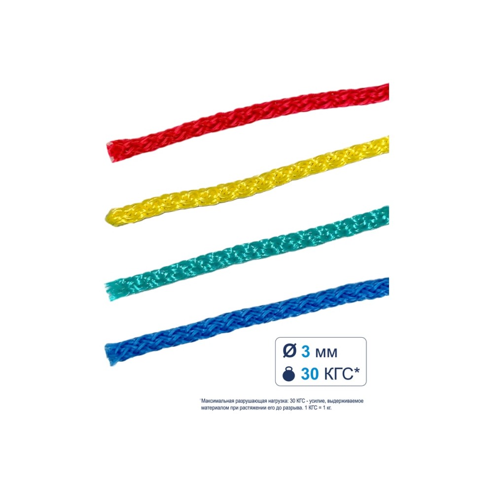 Тип шнур Вид вязаный Применение бытовое/хозяйственное Диаметр 3 мм Материал полипропилен Покрытие нет Цвет ассорти Разрывная нагрузка 30 кгс Наличие сердечника нет Вес нетто 0.056 кг Устойчивость к ультрафиолету да