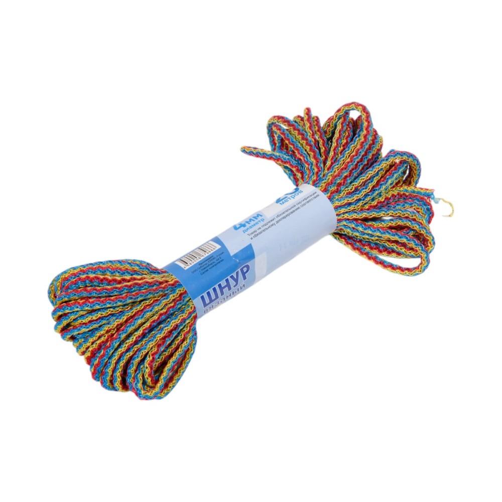 Тип шнур Вид вязаный Применение бытовое/хозяйственное Длина 20 м Диаметр 4 мм Материал полипропилен Покрытие нет Цвет желтый/красный/синий Разрывная нагрузка 40 кгс Наличие сердечника нет Вес нетто 0.05 кг Устойчивость к ультрафиолету даГарантия производителя 2 года