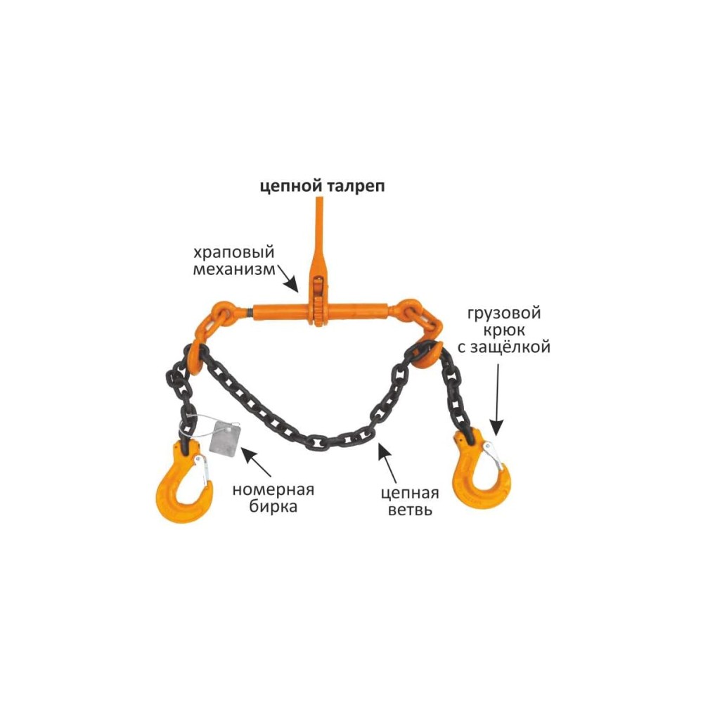 Крепежная цепь из двух элементов: цепного талрепа и цепной ветви. При помощи талрепа цепная ветвь ослабляется или натягивается. Талреп оснащен переключателем направления вращения ветви. Сама цепная ветвь служит для непосредственного крепления груза. На концах данного механизма расположены крюки.