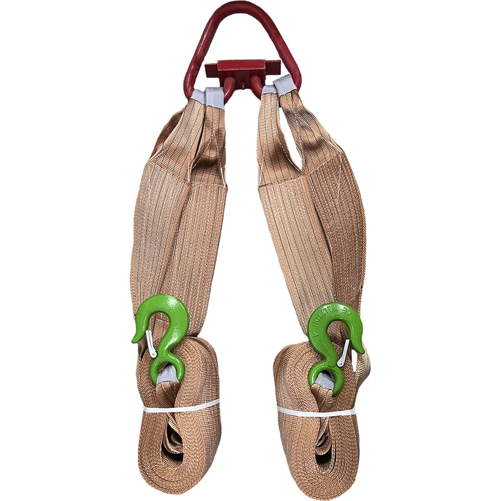 Двухветвевой текстильный строп ТамбовТехСнаб 2СТ 8 т, 4 м 7930130714689 представляет собой профессиональное приспособление для подъема и транспортировки грузов – крупногабаритных, тяжелых, легкоповреждаемых. Строп состоит из двух лент высокой прочности, соединенных треугольным звеном, с крюками на концах. Разные цвета изделий указывают на ширину ветвей и грузоподъемность системы.