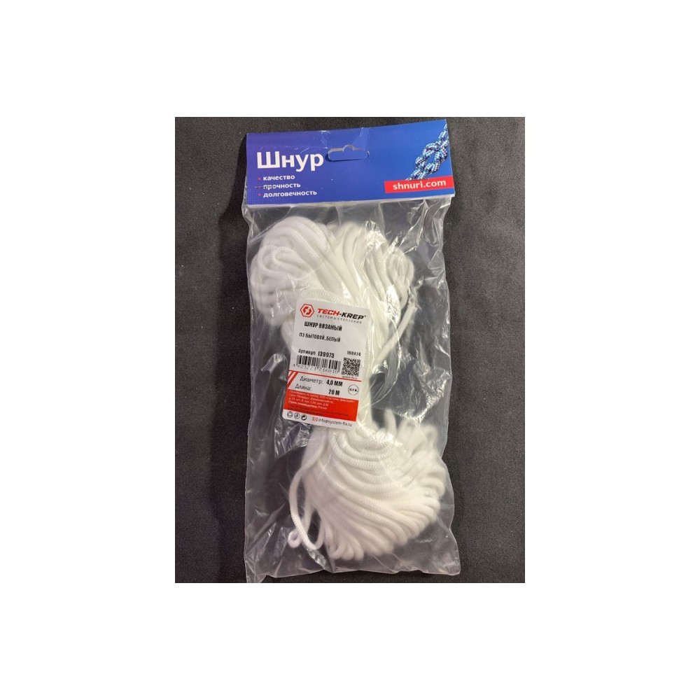 Вязаный шнур ПЭ бытовой 4 мм, белый, 20 м Tech-Krep 139973