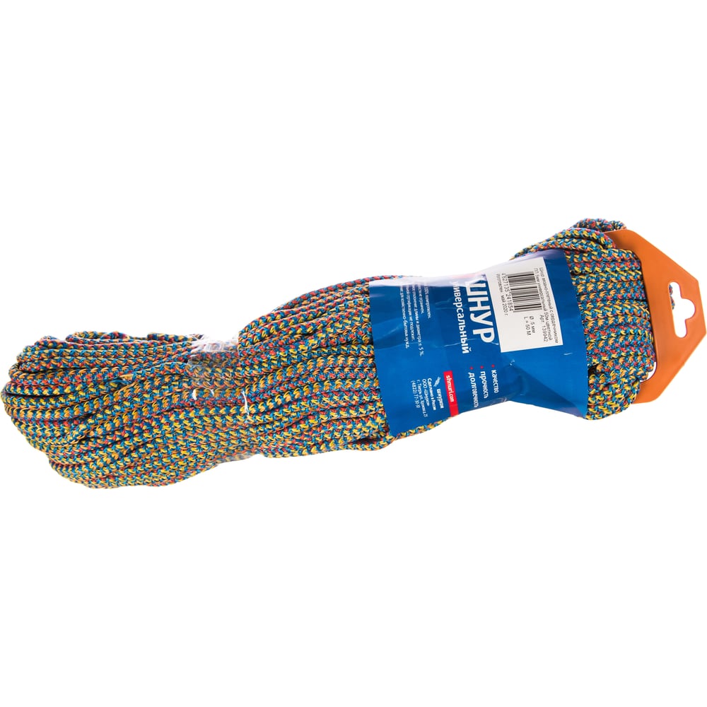 Тип шнур Вид плетеный Применение универсальное Длина 50 м Диаметр 5 мм Материал полипропилен Покрытие нет Цвет ассорти Наличие сердечника да Вес нетто 0.27 кг Устойчивость к ультрафиолету даГарантия производителя