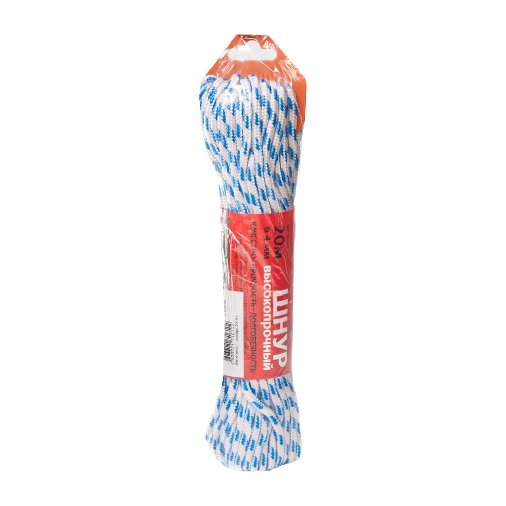 Тип шнур Вид плетеный Применение универсальное Длина 20 м Диаметр 4 мм Материал полипропилен Покрытие нет Цвет белый/синий Количество прядей 16 Наличие сердечника да Вес нетто 0.09 кг Устойчивость к ультрафиолету даГарантия производителя