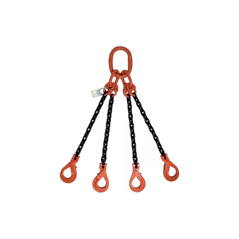 Стропы цепные 4СЦ изготавливаются с применением высокопрочных цепей класса Т8, комплектующих выдерживающих высокие нагрузки. Строп четырехветвевой обычно состоит из главного кольца типа NRLI c дополнительными кольцами, соединительных звеньев, соединяющих цепь с кольцом и крюка вилочного соединяющегося с цепью с помощью пальца и шплинта.