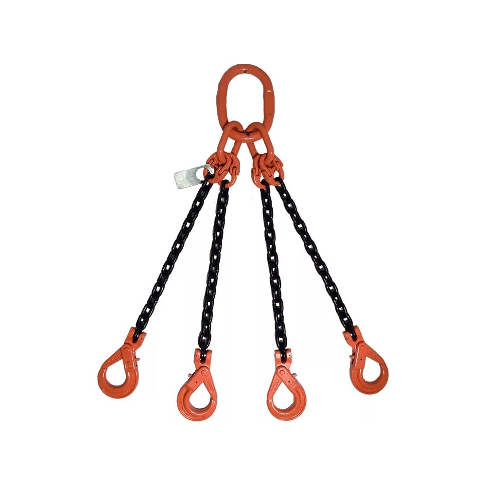 Стропы цепные 4СЦ изготавливаются с применением высокопрочных цепей класса Т8, комплектующих выдерживающих высокие нагрузки. Строп четырехветвевой обычно состоит из главного кольца типа NRLI c дополнительными кольцами, соединительных звеньев, соединяющих цепь с кольцом и крюка вилочного соединяющегося с цепью с помощью пальца и шплинта.